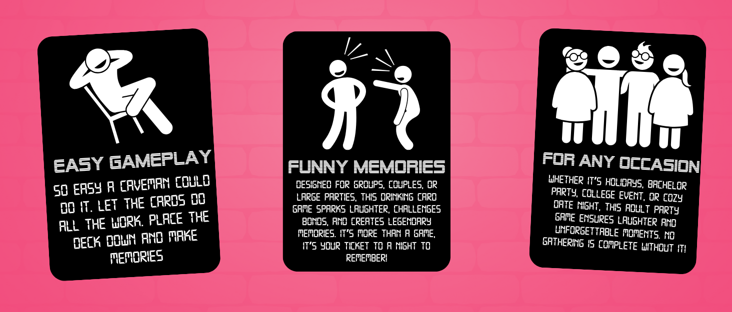 In accordance with the prompt of each card, take a sip of your libation. This will allow you to play more cards per game and keep the laughs going longer.